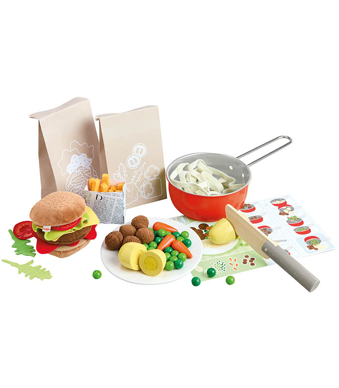 Leksaksmat kreativ lek Haba Matlåda. Setet innehåller ett färgglatt urval av ingredienser gjorda av högkvalitativt trä och mjukt tyg. Barnen kan laga läckra rätter som hamburgare, pommes frites, wraps, ramen eller köttbullar med grönsaker och potatis. Innehåller också receptkort som visuellt illustrerar tillagningen av rätterna och hjälper små kockar att imitera stegen.