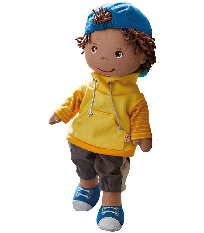 Haba mjuk docka Bruno. Mjuk docka med hår av chenille, broderade ögon, näsa och mun. Tygdocka med byxa, tröja och keps.